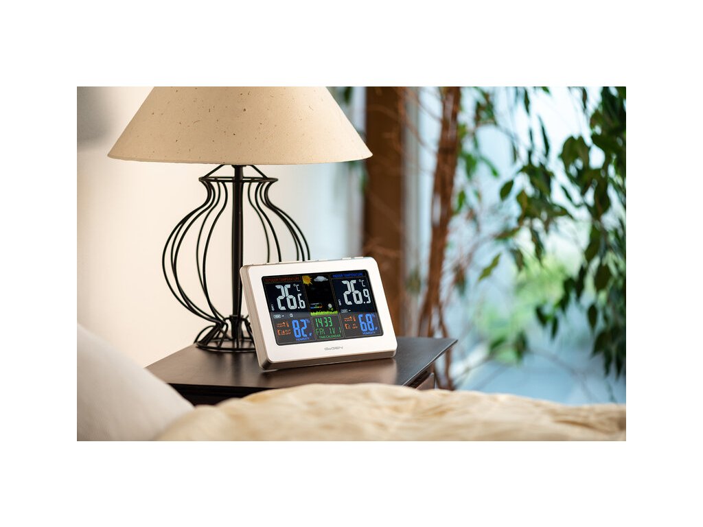 Na veľkom farebnom LCD displeji ľahko zistíte, aká je aktuálna vnútorná teplota a vlhkosť. Zároveň ale budete informovaní o vonkajšej teplote a vlhkosti. A to vďaka pribalenému teplotnému čidlu, s dosahom až 50 metrov (v závislosti od umiestnenia). Pre vonkajšie hodnoty meteostanice ukladá aj ich maxima a minima. Ľahko sa dá tiež nastaviť aj alarm pre konkrétny vonkajšiu teplotu. Napr. pri dosiahnutí bodu mrazu.